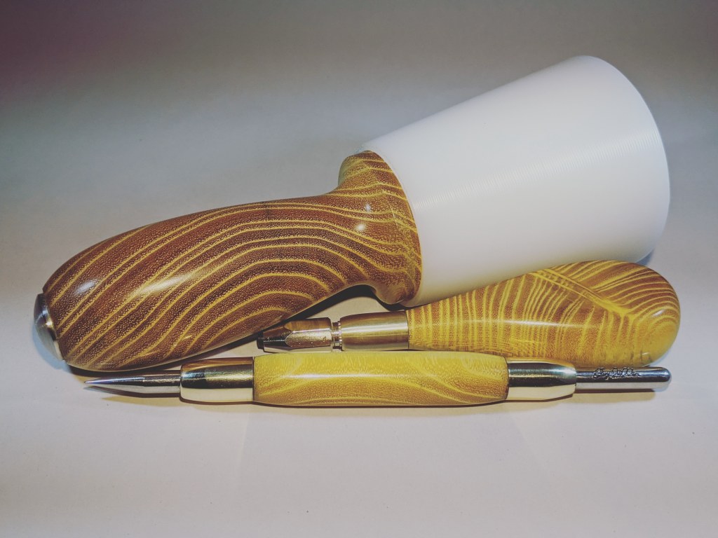 Today, Clay uses his own molds to produce the custom handle colors. He begins with a 2” x 2” x 5” mold, into which he puts his basic handle with wood removed to accommodate the resin. The colored resin is poured into the mold and then the mold is placed in a pressure chamber. The air pressure cures the resin, making it extremely hard. The handle can then be put on a lathe for final shaping. This process lends a unique individuality to each tool, which would be hard to achieve by using mass-produced blanks.